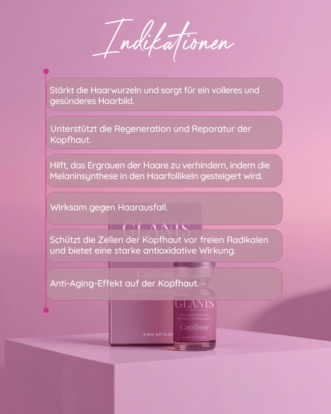• Haarausfall und Haarverdünnung• Geschwächte Haarwurzeln• Entzündliche Kopfhautzustände• Vorzeitiges Ergrauen• Eingeschränkte Mikrozirkulation• Verbesserung der Haardichte