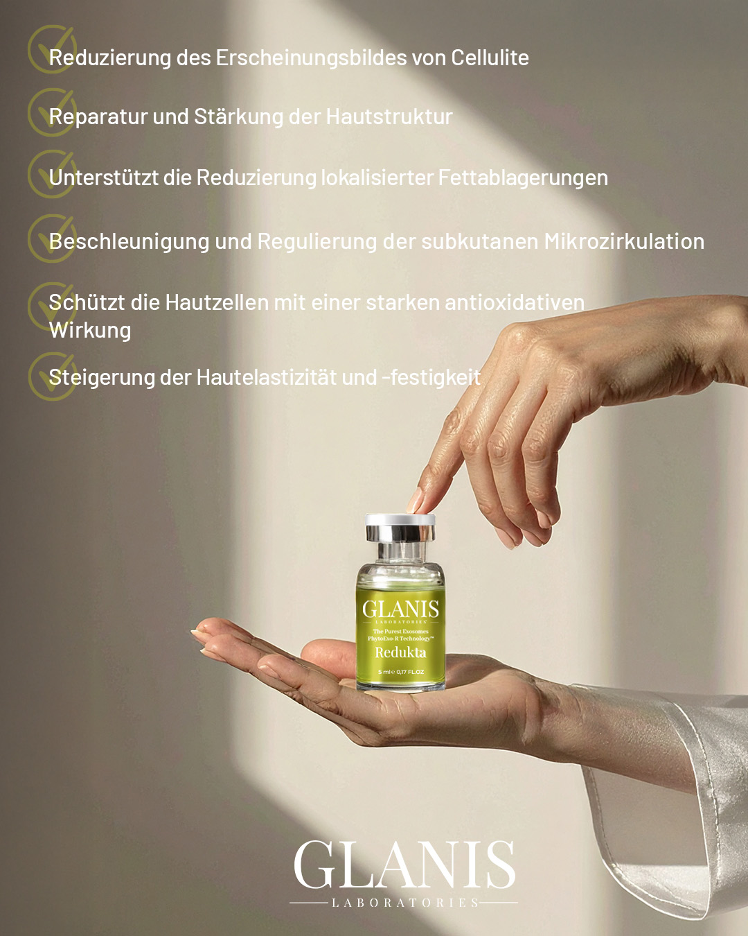 Redukta wurde aus einer synergistischen Kombination von PhytoExo-R™ Persea Gratissima, Centella Asiatica, Glycine Max und Prunus Amygdalus Dulcis Stammzell-Exosomen entwickelt und nutzt eine mit small RNAs angereicherte EV-Technologie, um Cellulite und Gewebeerschlaffung auf zellulärer Ebene zu adressieren.